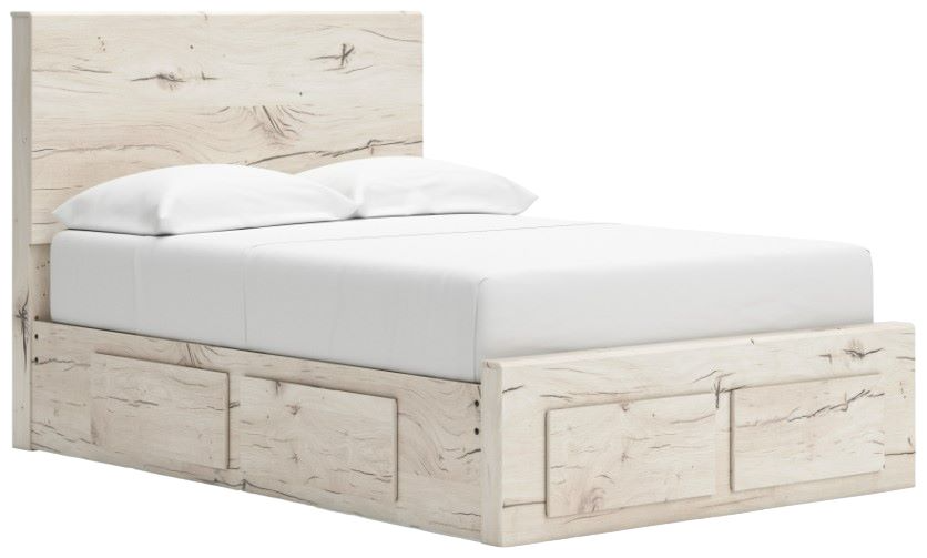 Comprend une tête de lit à panneaux, un pied de lit de rangement, 2 unités de rangement sous le lit et des lattes à roulettes.
